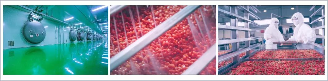 早康公司擁有2個生產工廠,其中老工廠占地52畝,主要生產加工枸杞干果和枸杞原漿系列產品。公司擁有年產6000噸枸杞干果生產線,5000噸枸杞原漿生產線,日產48萬瓶枸杞原液灌裝生產線,日產50萬袋枸杞原漿生產線。新工廠占地138.2畝,配套大型凍干設備12臺,年生產規模是1000噸凍干鎖鮮枸杞。2021年新建成的GMP藥品級無塵凈化枸杞原漿灌裝車間及凍干枸杞車間為國內第一家。